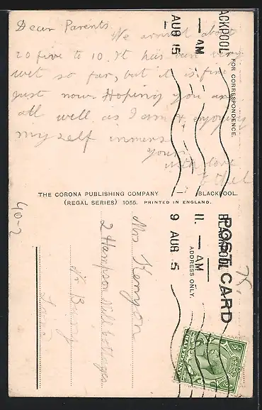 Personenbezogene Daten auf der Rückseite der Karte wurden durch blauen Textmarker unkenntlich gemacht. Die blauen Stellen sind auf die Vorderseite durchgeweicht und wirken sich negativ auf das Postkartenfoto aus