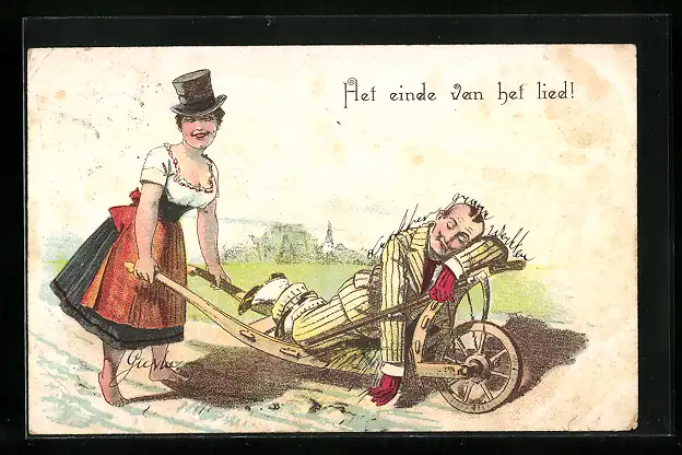 AK Frau im Dirndl mit Zylinder schiebt einen schlafenden Trinker in einer Schubkarre nach Hause