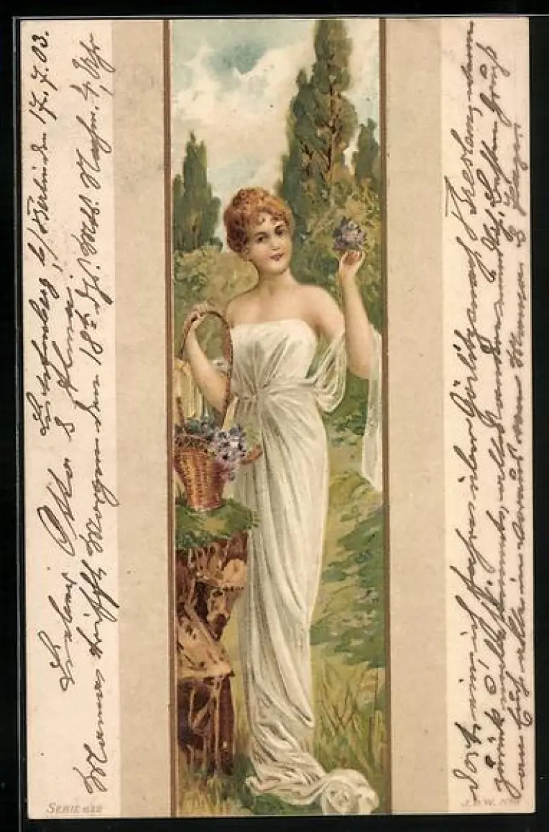 AK Frau im weissen Gewand und lilanem Flieder in einem Korb, Jugendstil