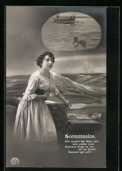 AK Frau in Gedanken bei ihrem Gatten auf See, Matrose im Schwimmreif wird gerettet