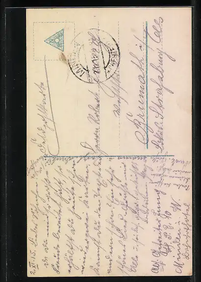 Personenbezogene Daten auf der Rückseite der Karte wurden durch blauen Textmarker unkenntlich gemacht. Die blauen Stellen sind auf die Vorderseite durchgeweicht und wirken sich negativ auf das Postkartenfoto aus