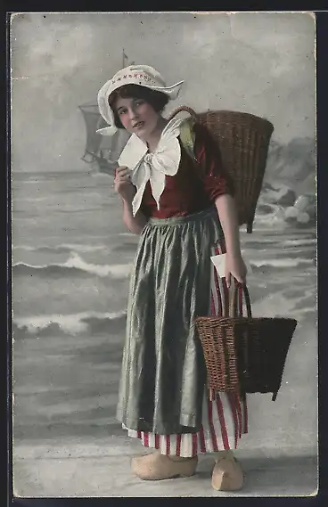 AK Frau in niederländischer Tracht, Holzschuhe