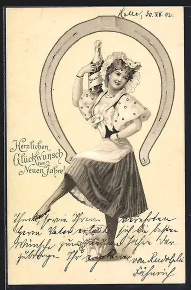 AK Frau mit Sektflasche unter einem Hufeisen, Neujahrsgruss