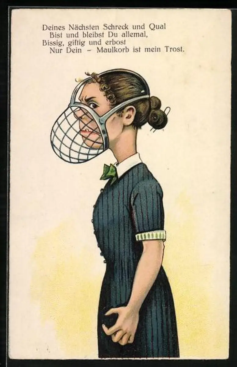 AK Frau mit einem Maulkorb, frauenfeindlicher Humor