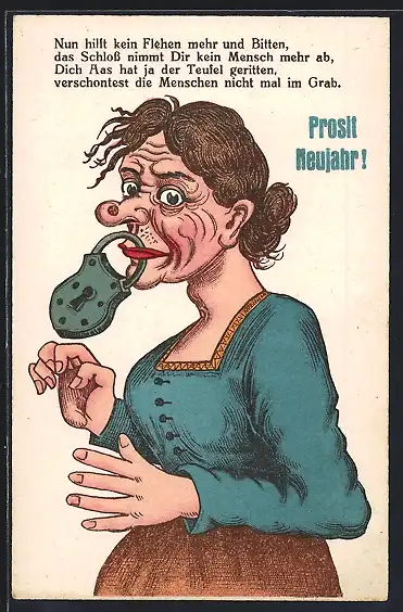 AK Frau mit verschlossenem Mund, frauenfeindlicher Humor