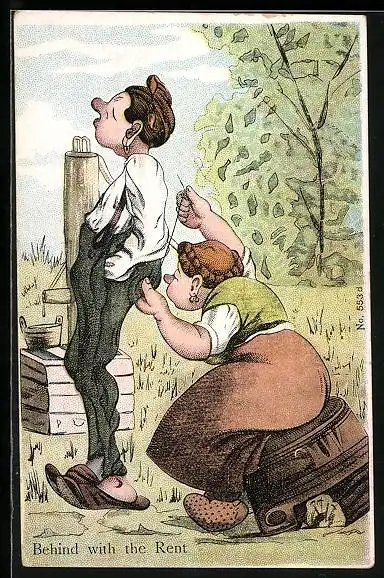 AK Frau näht dem Mann die Hose, Scherz