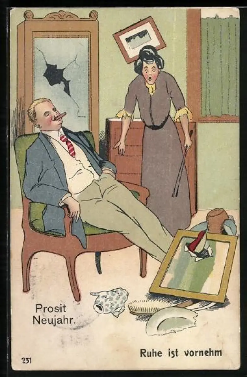 AK Frau sieht entsetzt das Chaos, was ihr Mann Neujahr angerichtet hat