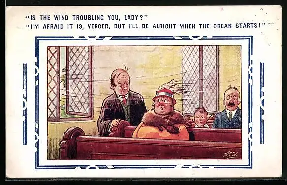 AK Frau sitzt bei Zugluft in der Kirche, Scherz