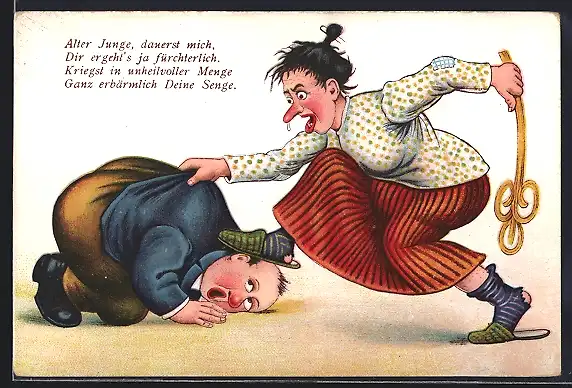 AK Frau verprügelt ihren Mann, frauenfeindlicher Humor