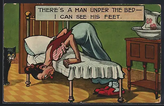 AK Frau verwechselt ihre eigenen Füsse mit denen eines Mannes, frauenfeindlicher Humor