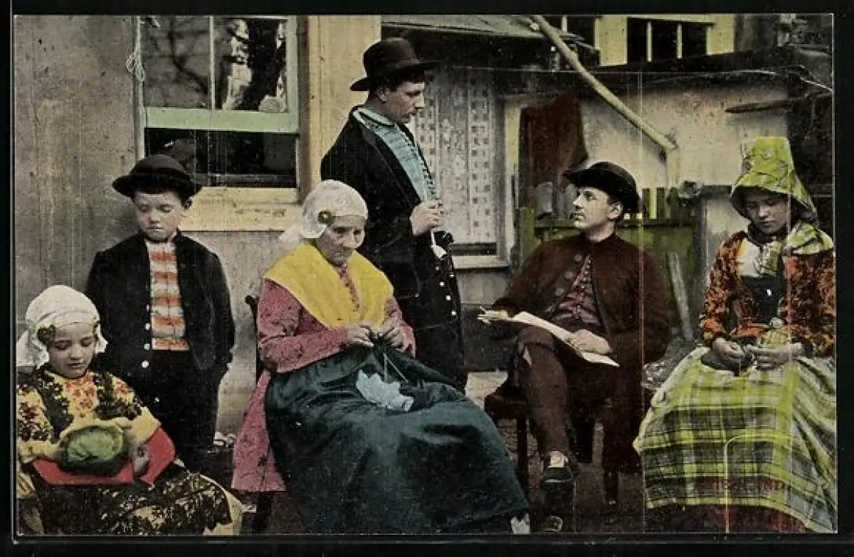 AK Frauen stricken zwischen ihren Männern