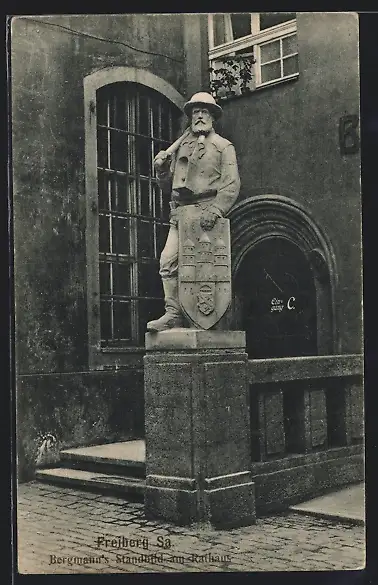 AK Freiberg /Sa., Bergmann`s Standbild am Rathaus