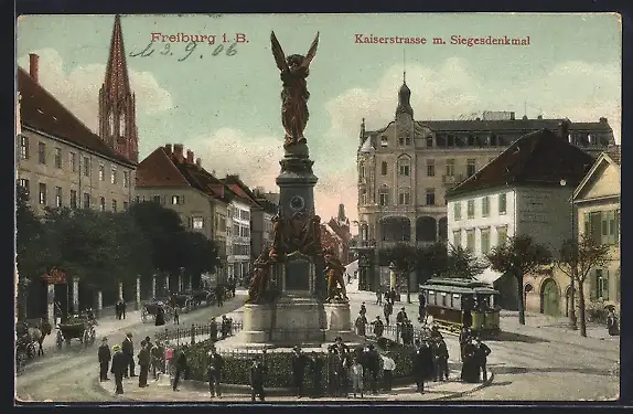 AK Freiburg / Breisgau, Partie beim Siegerdenkmal, Strassenbahn