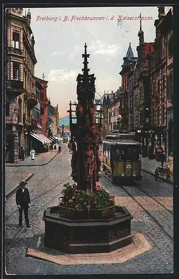AK Freiburg i. B., Fischbrunnen in der Kaiserstrasse und Strassenbahn