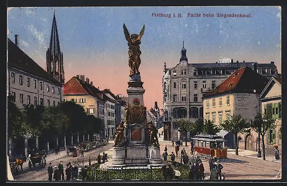 AK Freiburg i. B., Partie beim Siegesdenkmal mit Strassenbahn