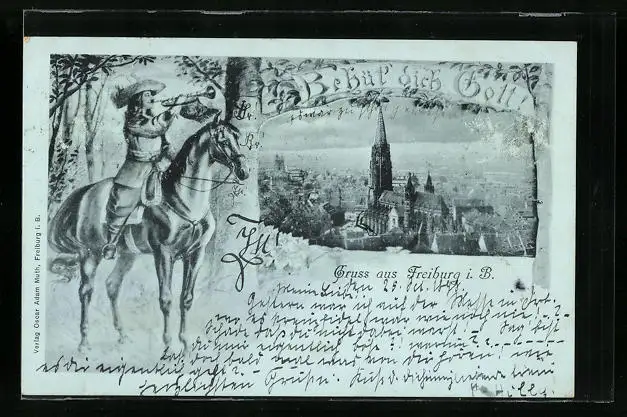 AK Freiburg i. B., Teilansicht mit Kirche, Trompeter zu Pferde