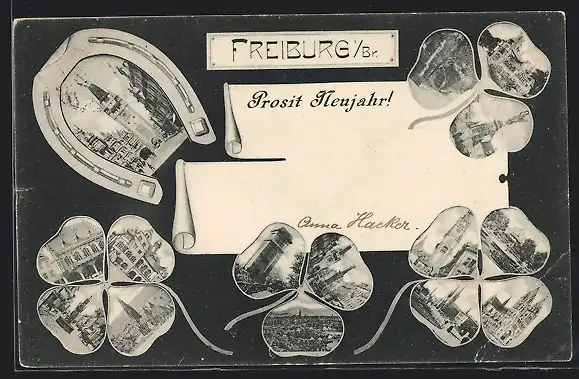 AK Freiburg i. Br., Strassenpartien mit Kleeblatt-Passepartout