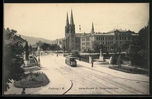 AK Freiburg / i.B., Kaiserbrücke mit Johanniskirche und Strassenbahn