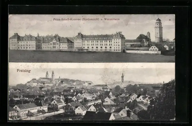 AK Freising, Ortsansicht aus der Vogelschau, Prinz-Arnulf-Kaserne mit Wasserturm