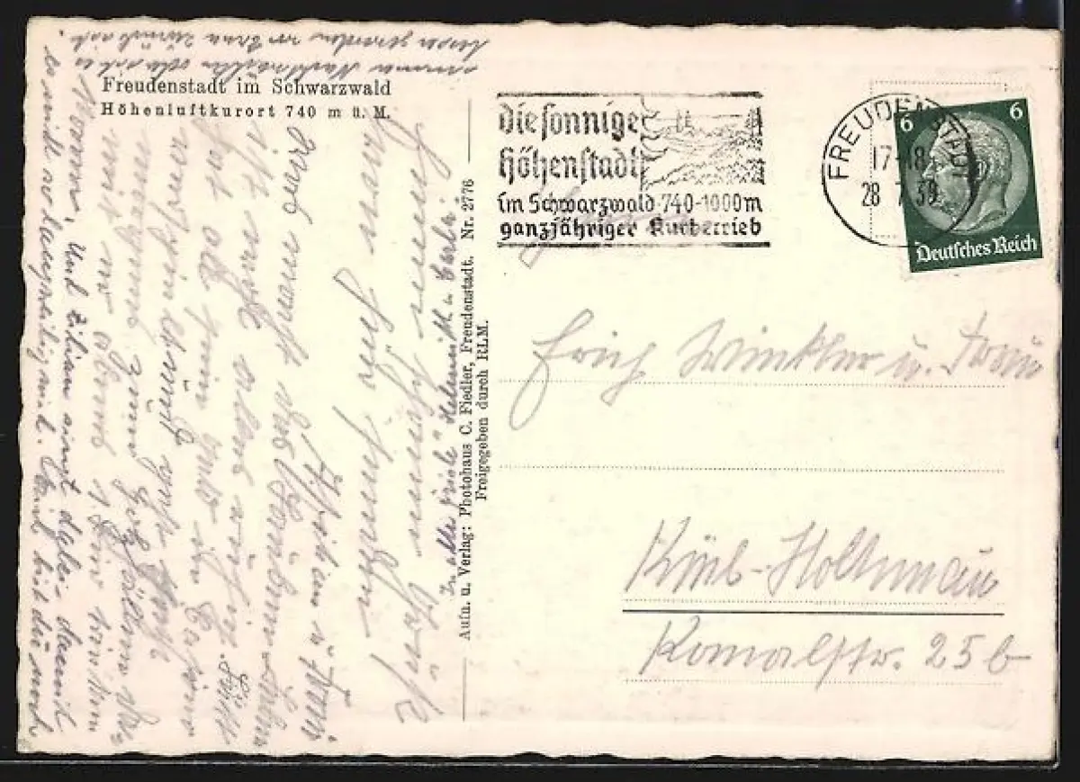 Personenbezogene Daten auf der Rückseite der Karte wurden durch blauen Textmarker unkenntlich gemacht. Die blauen Stellen sind auf die Vorderseite durchgeweicht und wirken sich negativ auf das Postkartenfoto aus