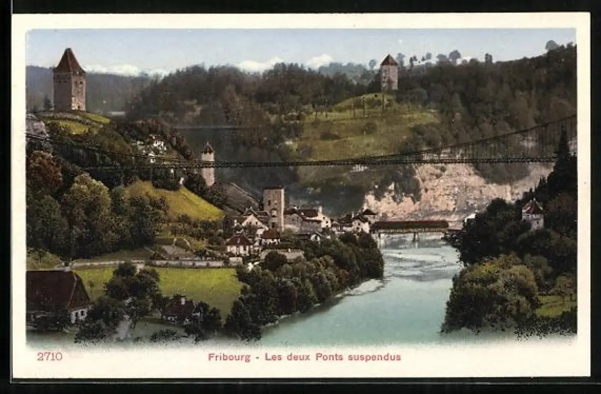 AK Fribourg, Les deux Ponts suspendu, Ortsrand mit Brücke