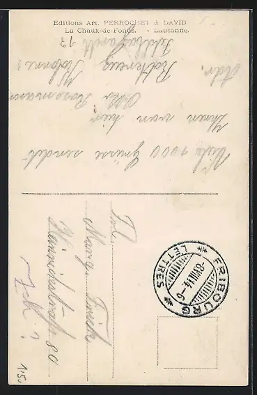 Personenbezogene Daten auf der Rückseite der Karte wurden durch blauen Textmarker unkenntlich gemacht. Die blauen Stellen sind auf die Vorderseite durchgeweicht und wirken sich negativ auf das Postkartenfoto aus