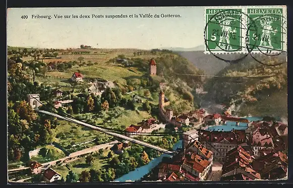 AK Fribourg, Vue sur les deux Ponts suspendus et la Vallée du Gotteron