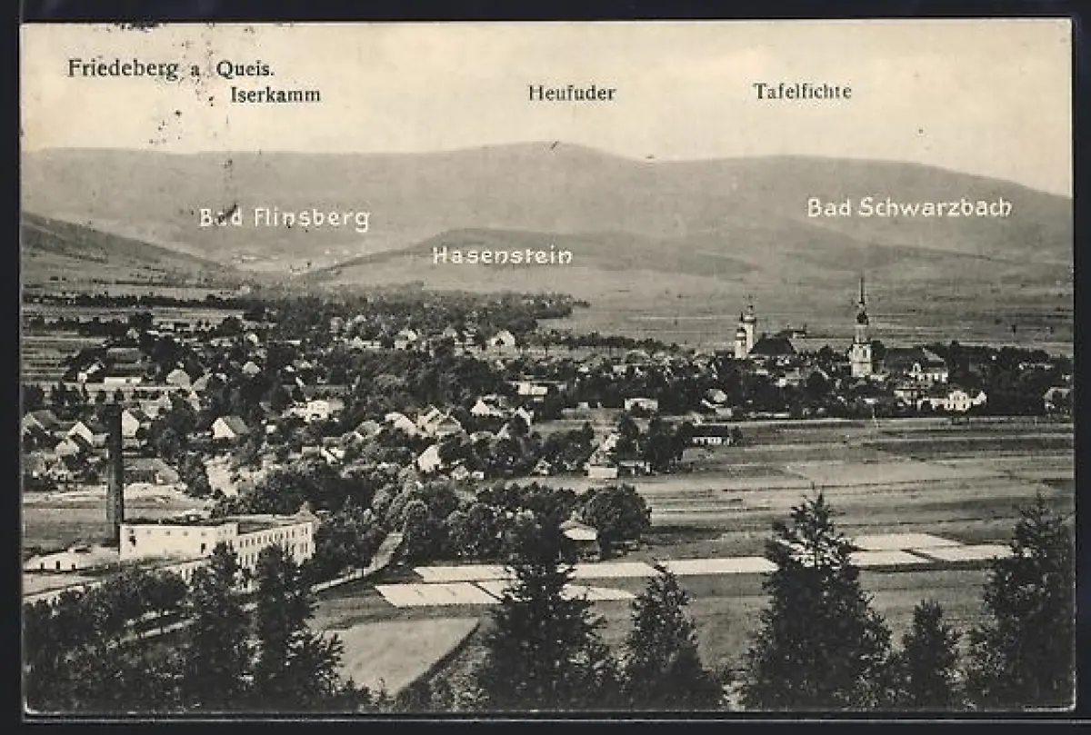 AK Friedeberg a. Queis, Aussicht auf Bad Flinsberg, Hasenstein und Bad Schwarzbach mit dem Iserkamm