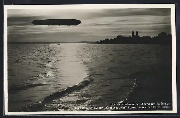 AK Friedrichshafen, Abend am Bodensee, Das Luftschiff LZ 127 Graf Zeppelin kommt von einer Fahrt zurück