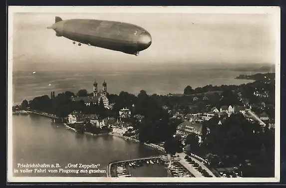 AK Friedrichshafen /Bodensee, Graf Zeppelin in Fahrt über die Ortschaft, Ansicht vom Flugzeug aus
