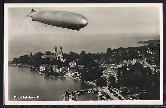 AK Friedrichshafen /Bodensee, Graf Zeppelin in Fahrt über die Ortschaft, Ansicht vom Flugzeug aus