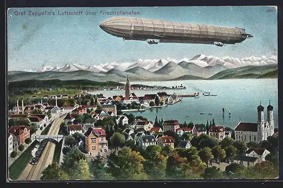 AK Friedrichshafen, Graf Zeppelin`s Luftschiff fliegt über den Ort
