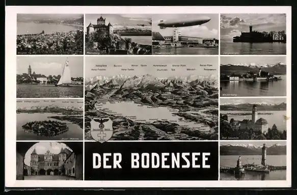 AK Friedrichshafen, Zeppelin über dem Bodensee, Wasserburg, Insel Mainau, Reichsadler mit