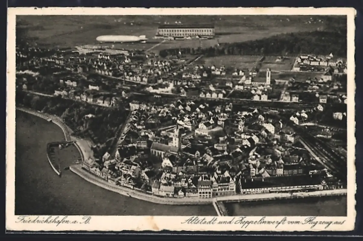 AK Friedrichshafen i. B., Altstadt und Zeppelinwerft vom Flugzeug aus