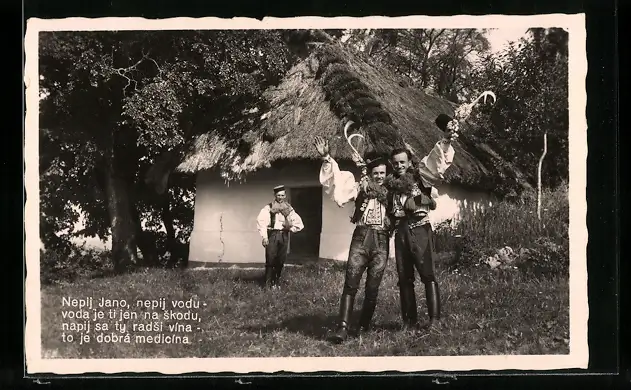 AK Fröhliche Männer in tschechischer Tracht vor einer strohgedeckten Hütte
