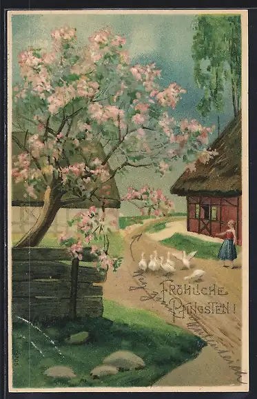 AK Fröhliche Pfingsten, Dorfpartie im Frühling