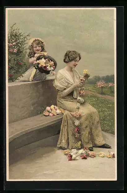 AK Fröhliche Pfingsten, Mutter und Tochter binden Blumekränze mit Rosenblüten