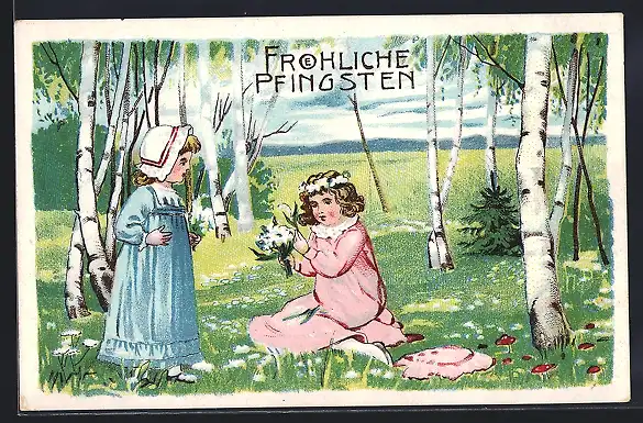 AK Fröhliche Pfingsten, Zwei Mädchen im Frühlingswald