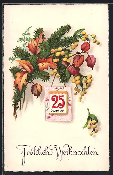 AK Fröhliche Weihnachten, Kalenderblatt hängt an einem Tannenzweig
