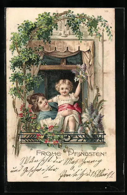 AK Frohe Pfingsten, Mädchen winkt mit Flieder aus dem Fenster