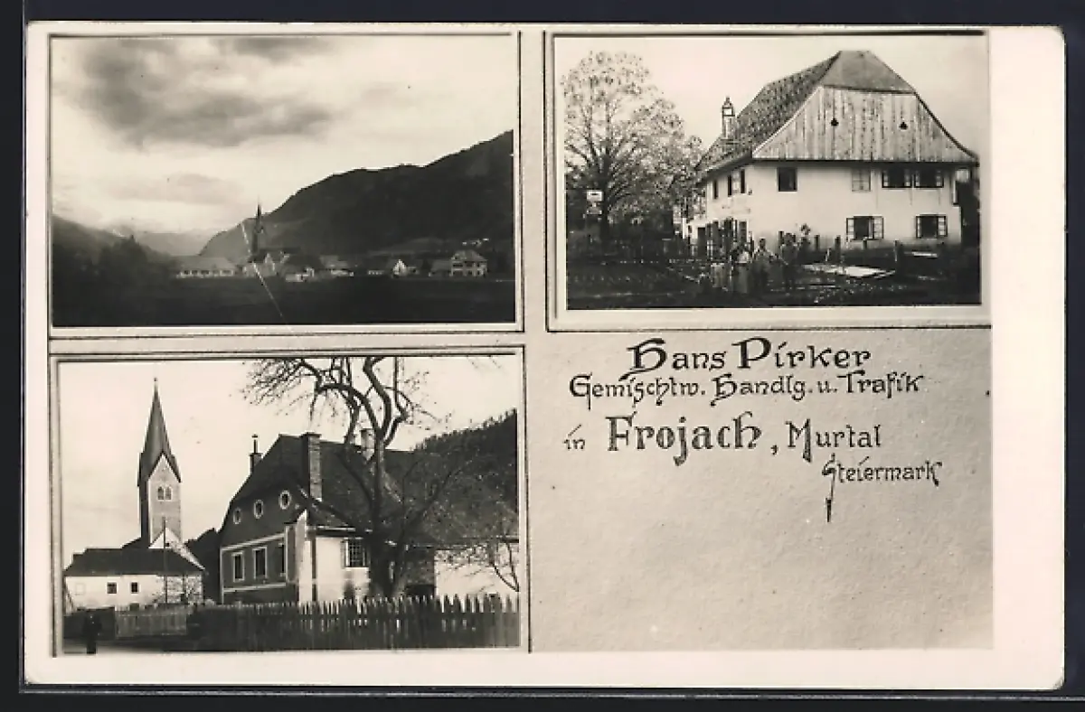 AK Frojach /Murtal, Hans Pirker Gemischtwarenhandlung u. Trafik, Kirche im Ort