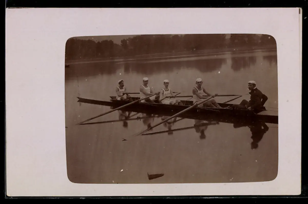 AK Fünf Sportler in einem Ruderboot
