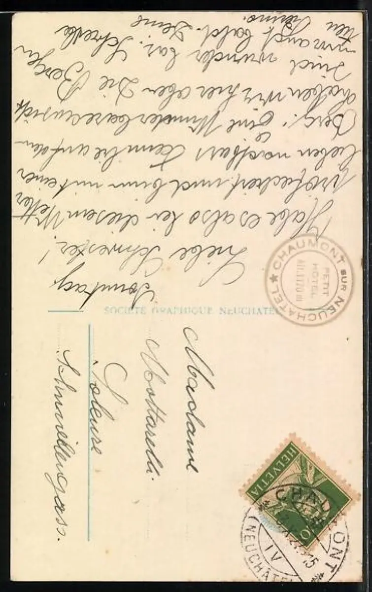 Personenbezogene Daten auf der Rückseite der Karte wurden durch blauen Textmarker unkenntlich gemacht. Die blauen Stellen sind auf die Vorderseite durchgeweicht und wirken sich negativ auf das Postkartenfoto aus