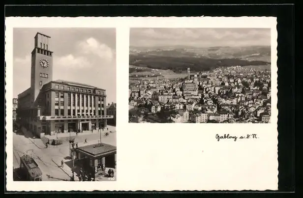 AK Gablonz / Jablonec Nad Nisou, Strassenbahn am Rathaus, Totalansicht