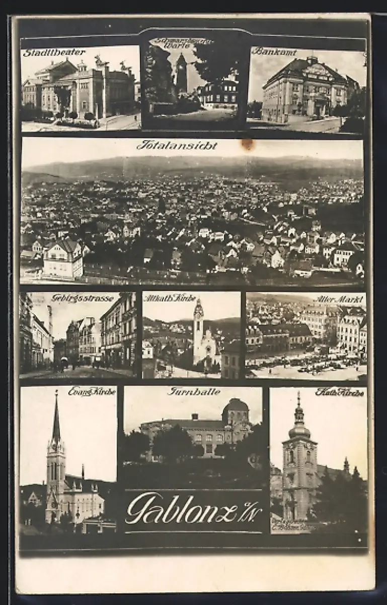 AK Gablonz a. N., Bankamt, Stadttheater, Turnhalle