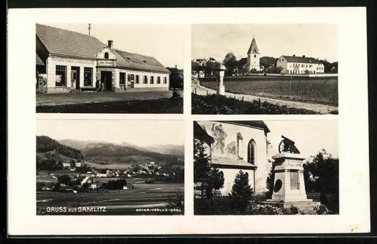 AK Gamlitz, Gemischtwarenhandlung Alex Trumler, Kirche, Denkmal, Ortspanorama