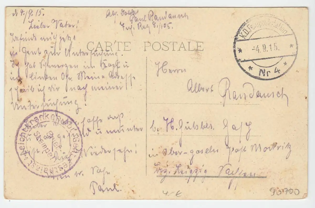 postalisch gelaufen, gestempelt: KD Feldpoststation Nr. 4, 4.9.15