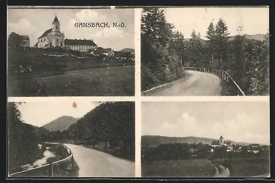 AK Gansbach, Strassenpartie mit Bäumen, Kirche