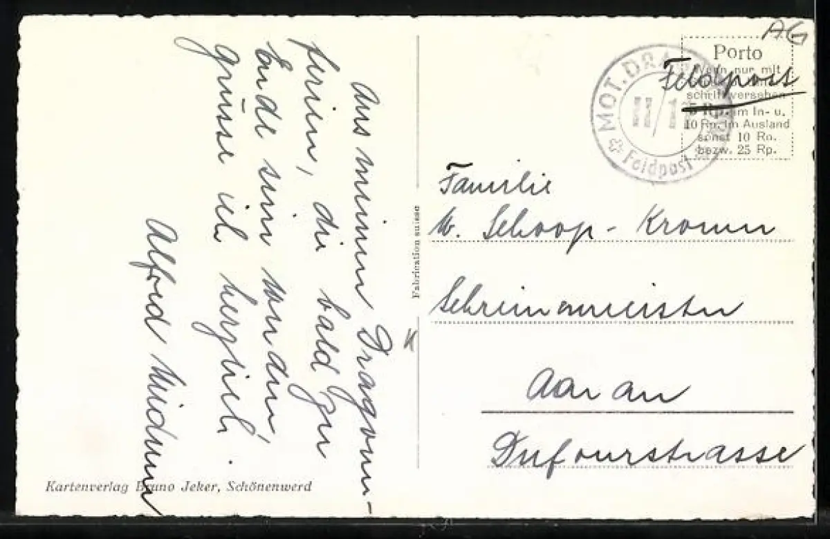 Personenbezogene Daten auf der Rückseite der Karte wurden durch blauen Textmarker unkenntlich gemacht. Die blauen Stellen sind auf die Vorderseite durchgeweicht und wirken sich negativ auf das Postkartenfoto aus