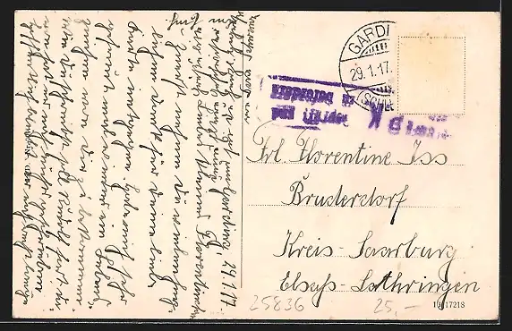 gelaufen 1917, Briefmarke entfernt, Eckknick li. unten, guter Zustand